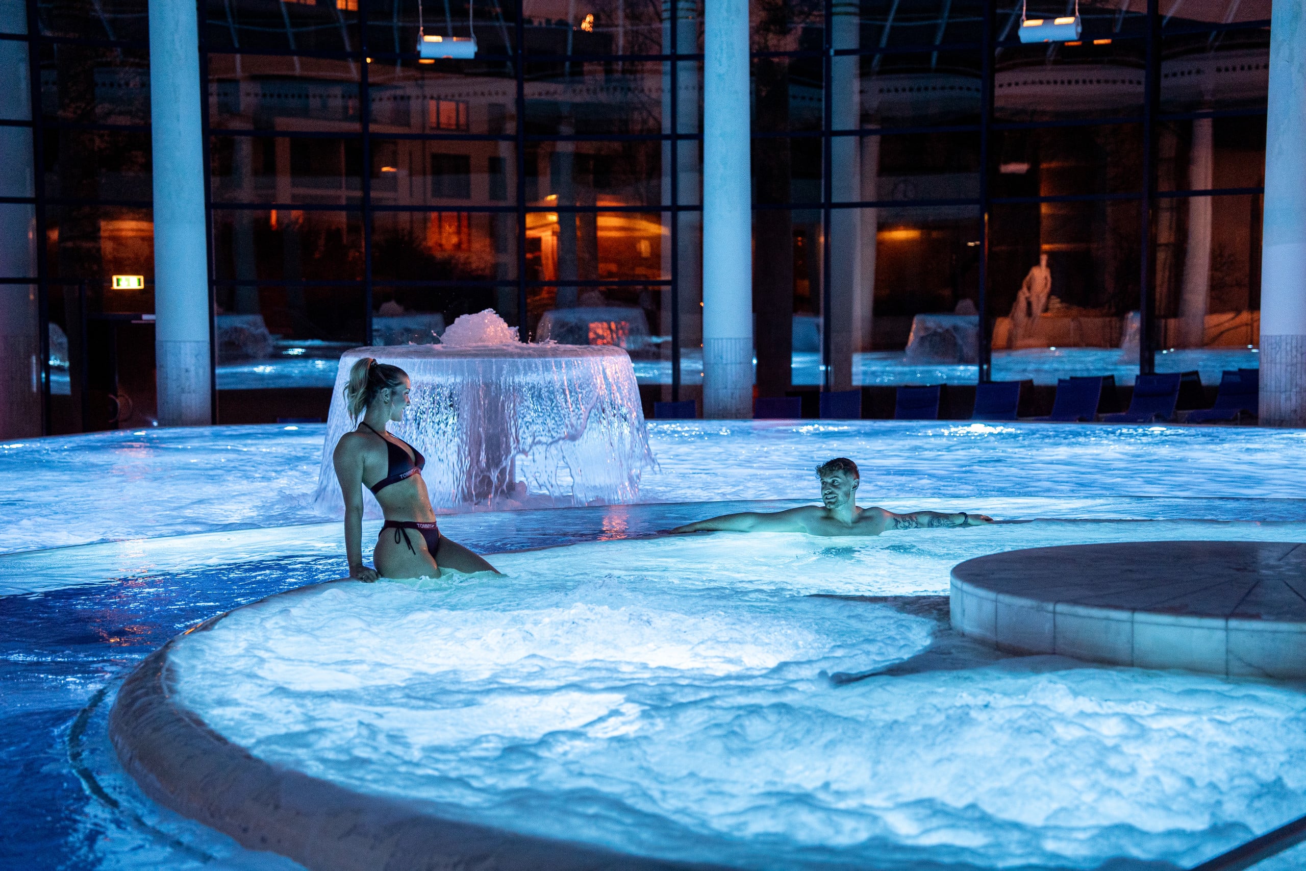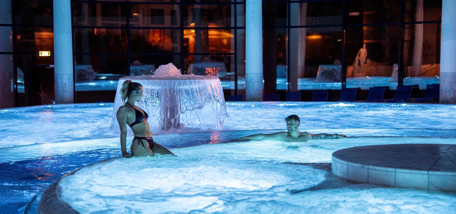 Gönnen Sie sich doppelte Entspannung im wohlig warmen Thermalwasser – eine herrliche Erfahrung für alle, die Zeit zu zweit verbringen möchten!